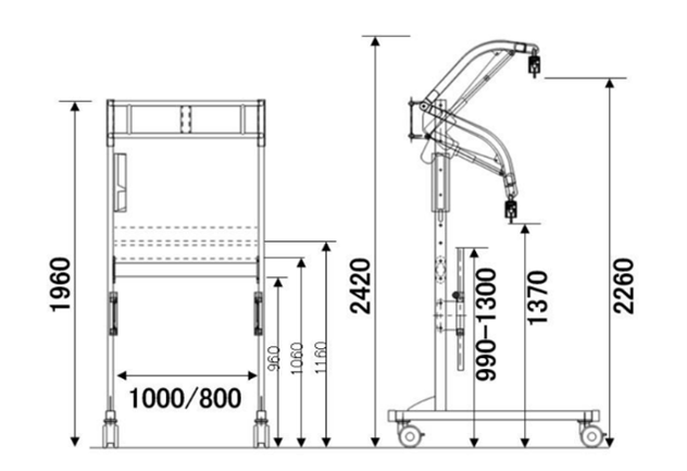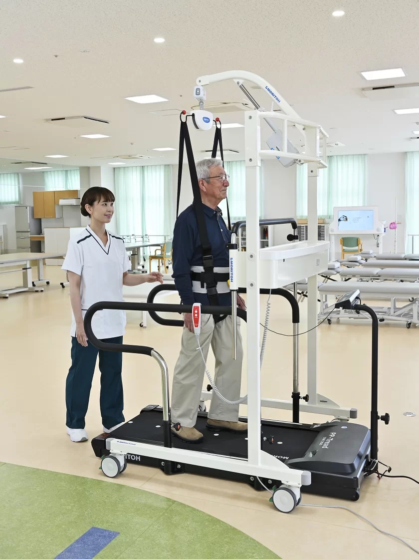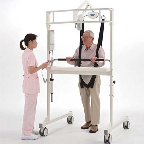 A patient support lift for use during walking training, movement, or physical therapy, using a harness and lift system designed to support the entire body weight. The device can support a maximum patient weight of 100 kg.