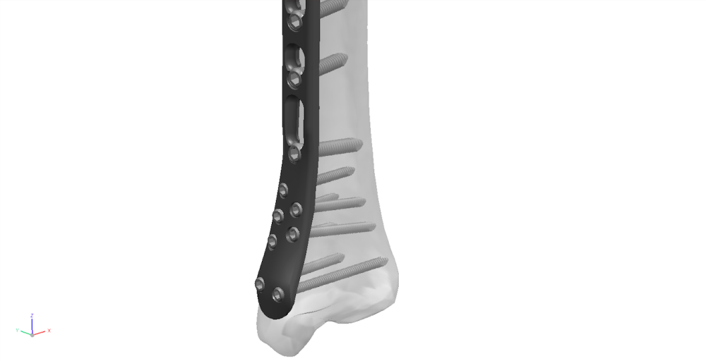 The distal tibia locking plate is low profile and conforms well to the patient’s bone. The plate is contoured to match the anatomy of the distal tibia, achieving the alignment and fit.